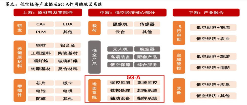 低空经济上游为主要的原材料及零部件;中游为低空经济的核心部分,包括载荷、低空产品和地面系统,其中5G-A在地面系统中起到网络支撑作用;下游为与产业进行融合。