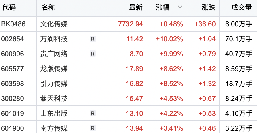 上证报中国证券网讯 6月3日早盘,文化传媒板块探低回升。截至9时52分,贵广网络三连板,炒股杠杆配资平台万润科技涨停。龙版传媒、引力传媒涨超8%,紫天科技、山东出版涨逾4%。